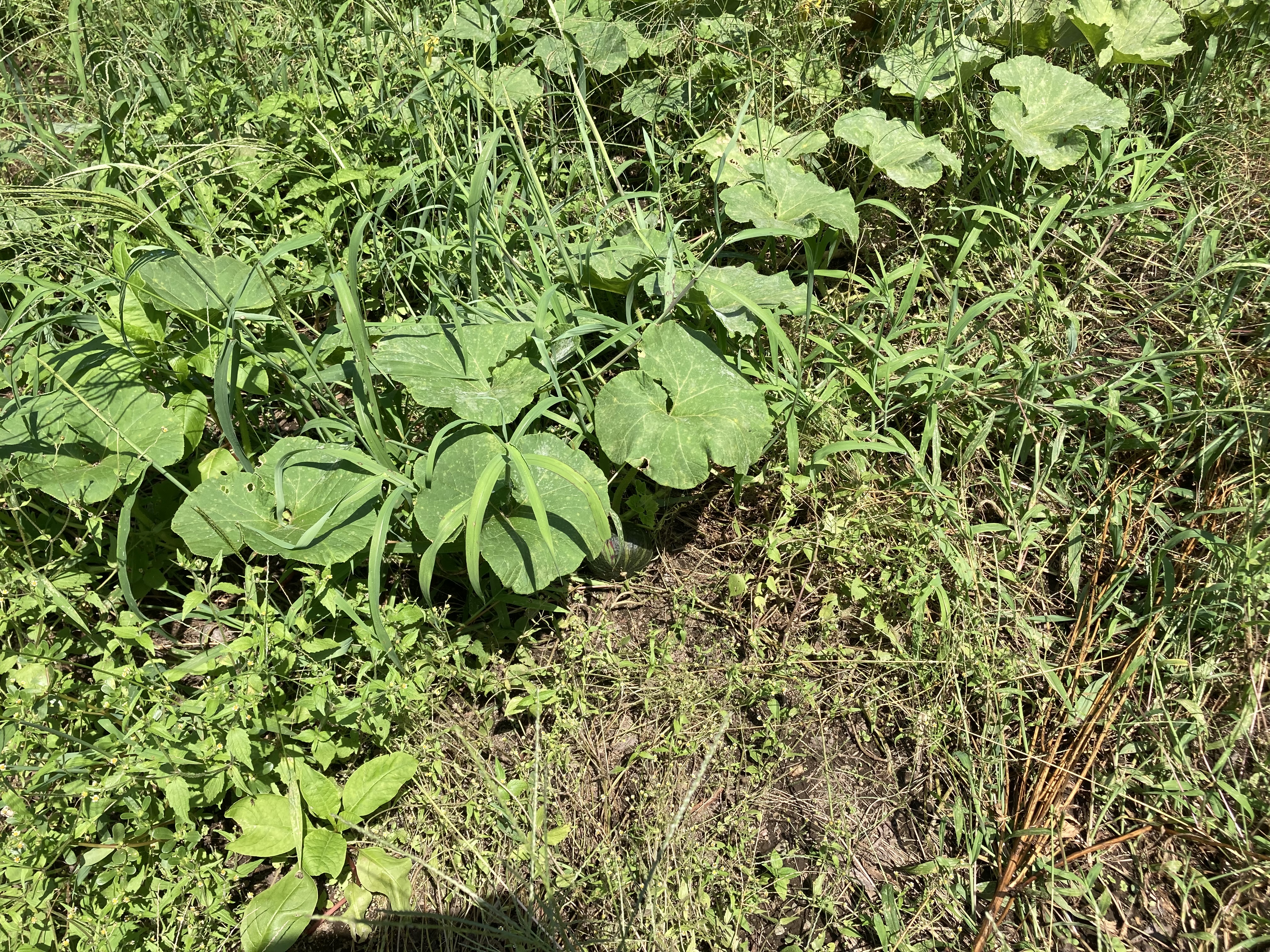 オフィスの放置栽培実験畑とは別の放置畑にオフィスと同じ姫カボチャを時期をずらせて5月下旬に定植しましたが6月中旬には葉が虫に食われて枯れかかってしまいました、それから3週間後には急速に復活してきて花を付けました。