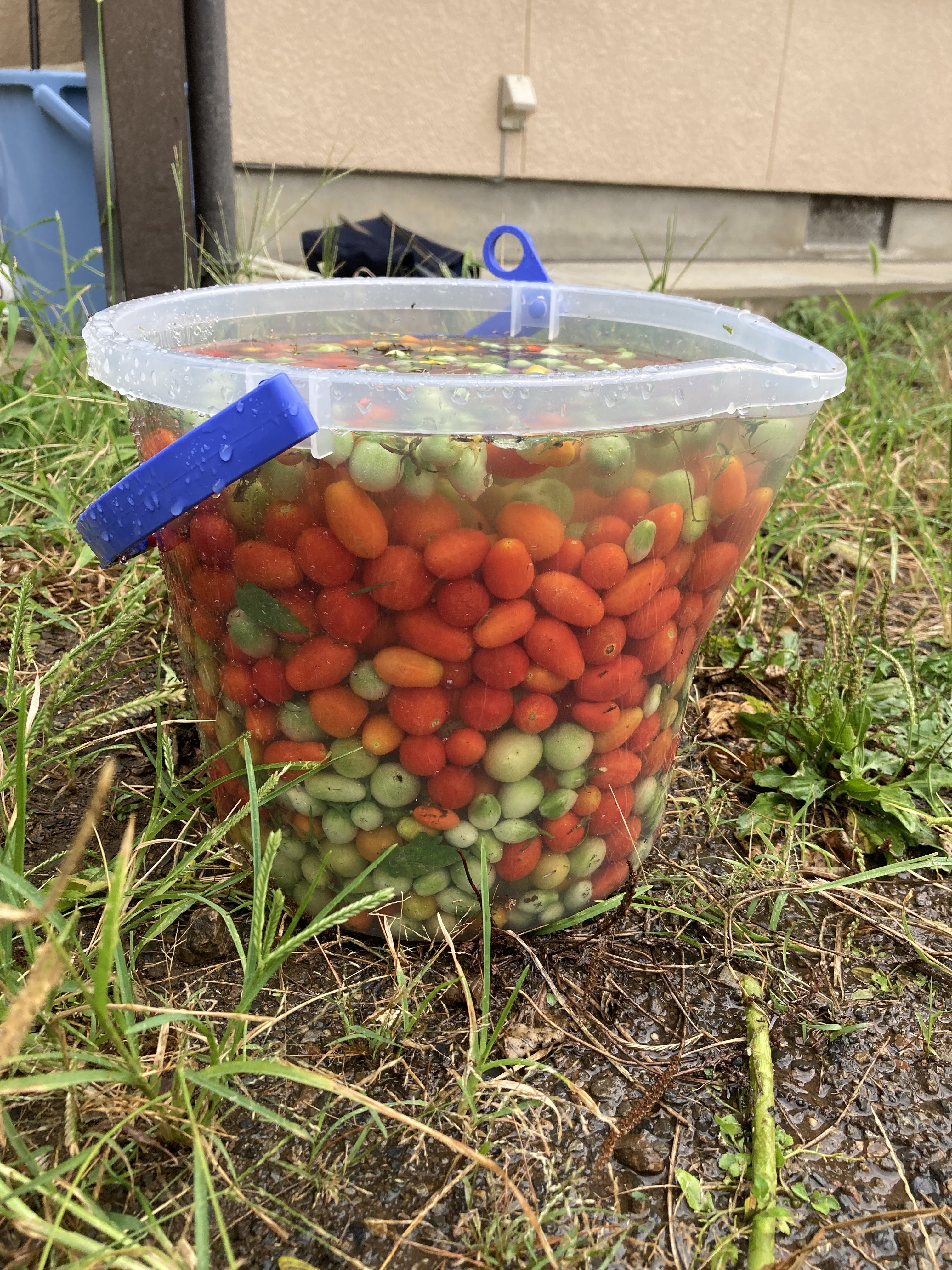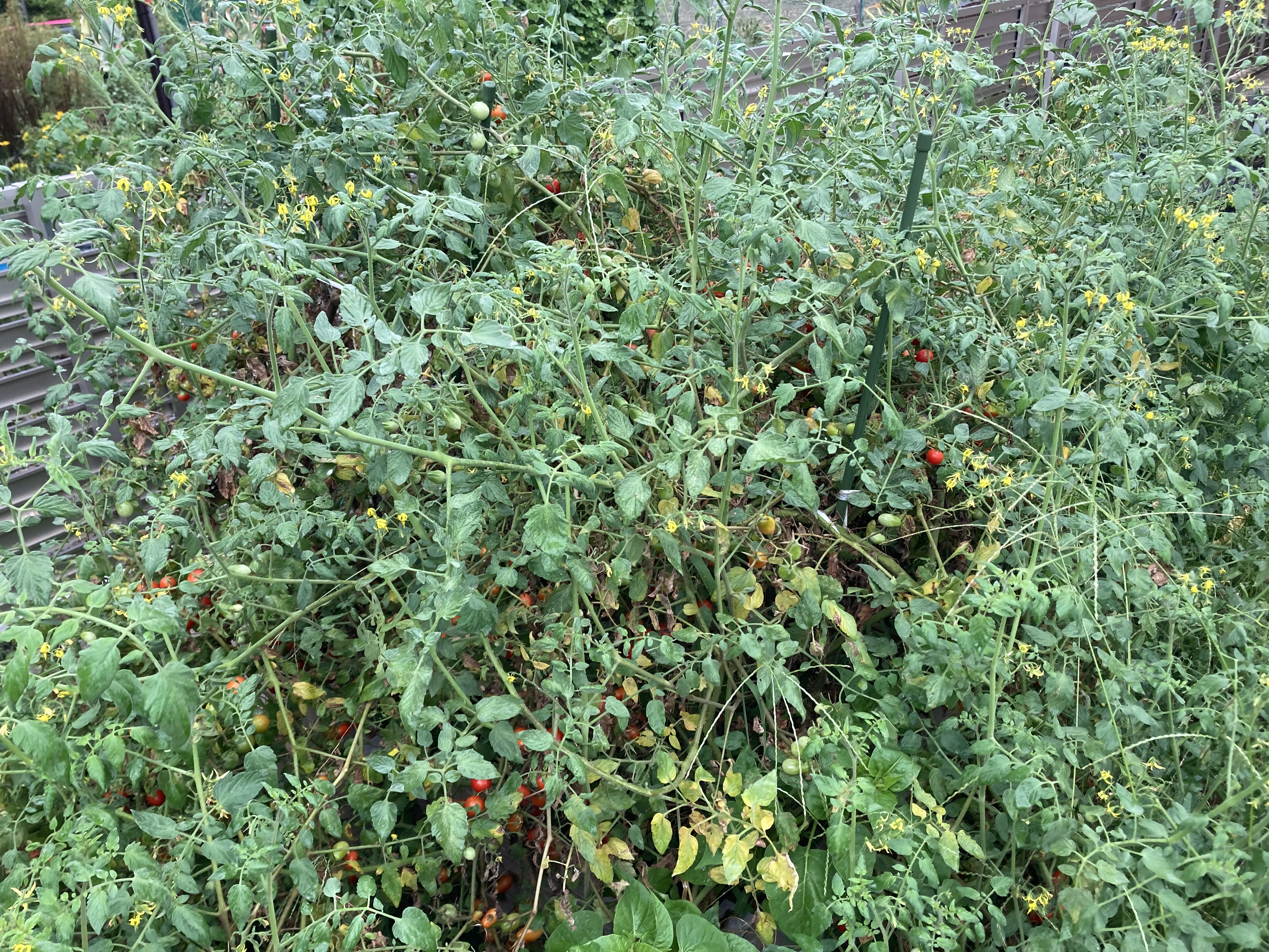 今回は次の野菜を植えるため苗を全て撤去して最後の大収穫を行いました、これまで収穫してきた都合2,000個を上回る数のミニトマトを収穫しました、最終的には1株で1,000個、都合4,000個を収穫し大成功を収めました。