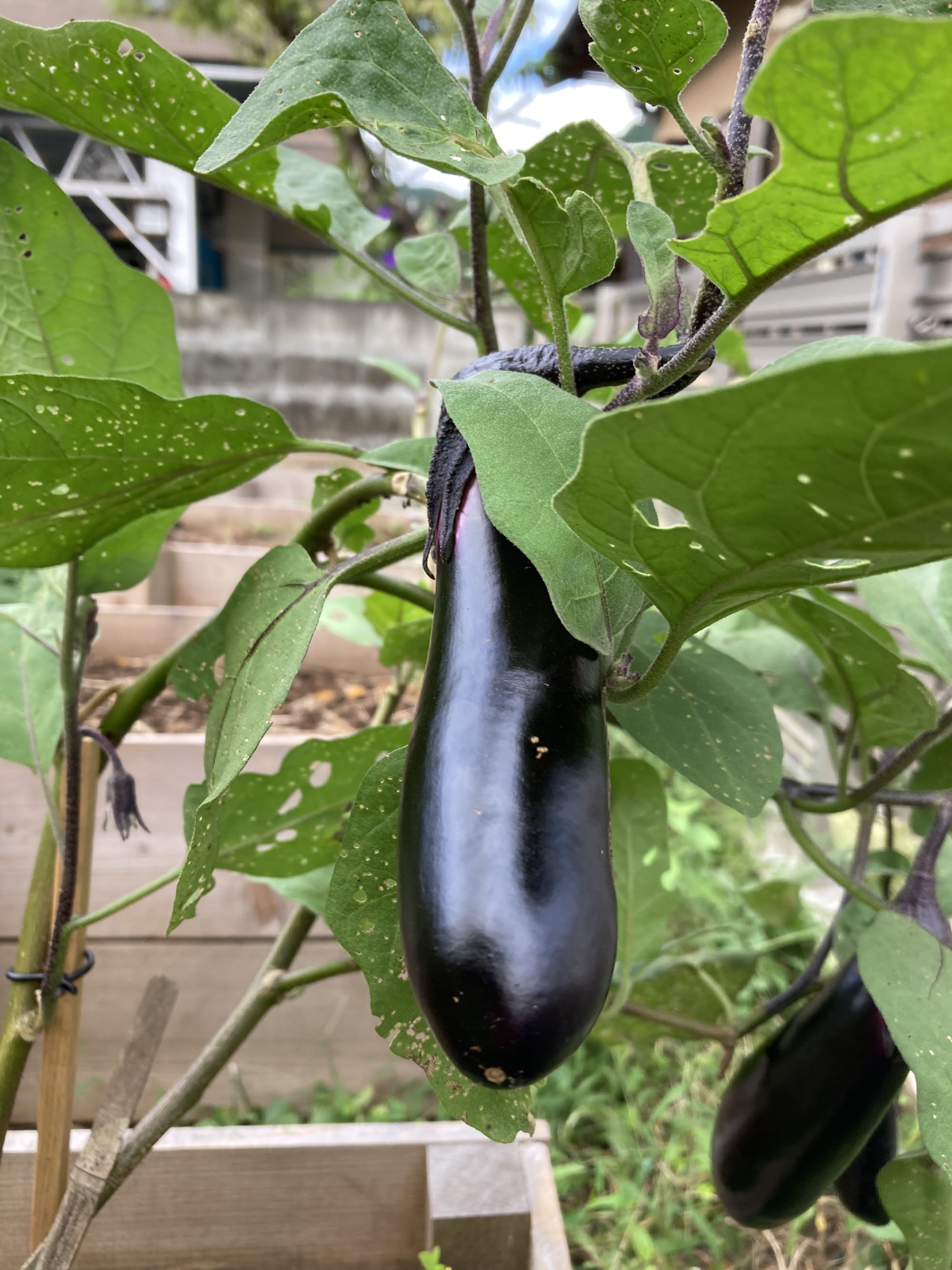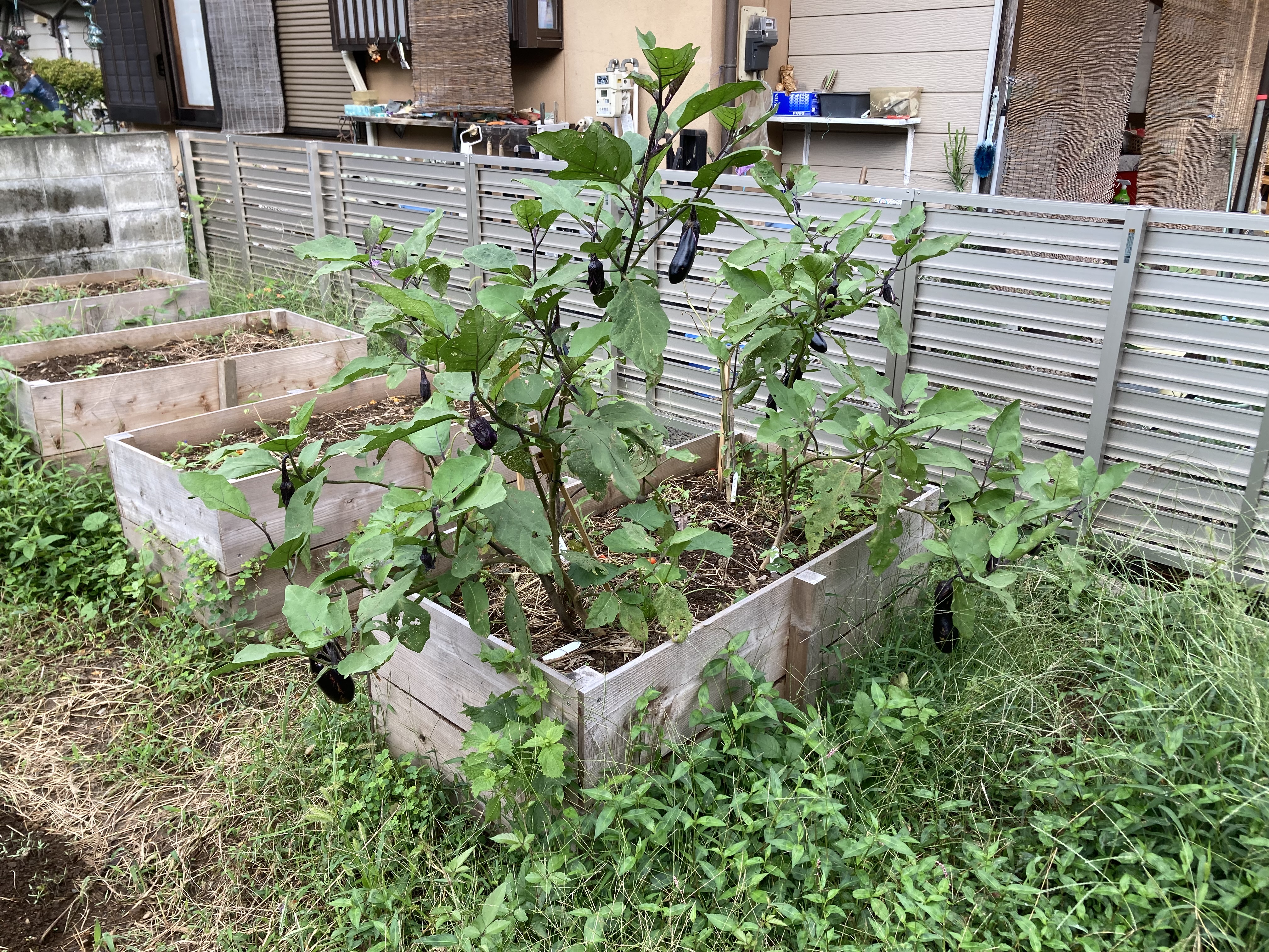 5月中旬レイズドベッドに長ナスを4株を植えました、植えてから約2ヶ月後には収穫でき、その後もどんどん収穫して1ヶ月で20個ほどを収穫しました。