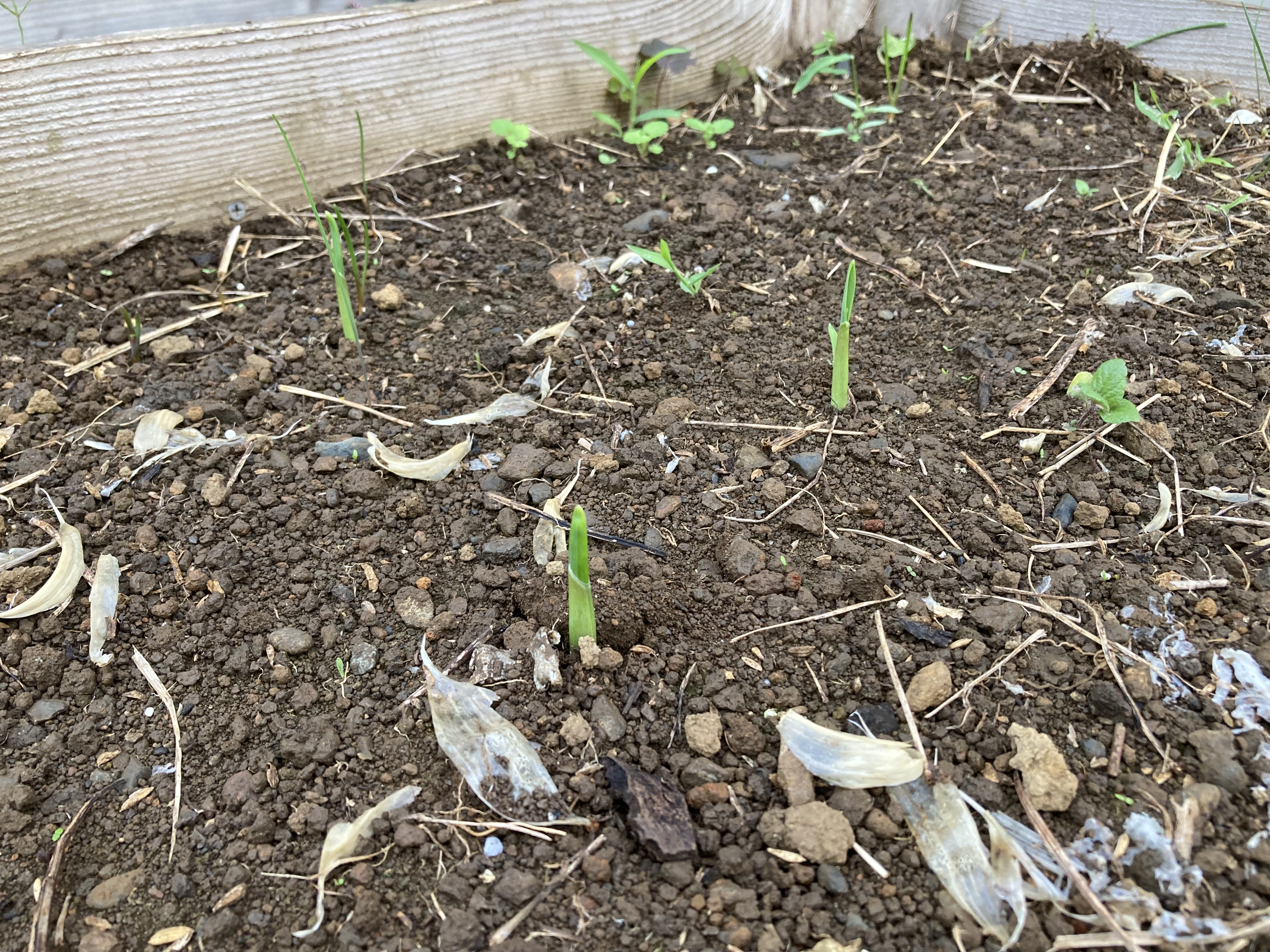 土の上に散らばっている白っぽいものはニンニクの球根を小分けする際にでた皮