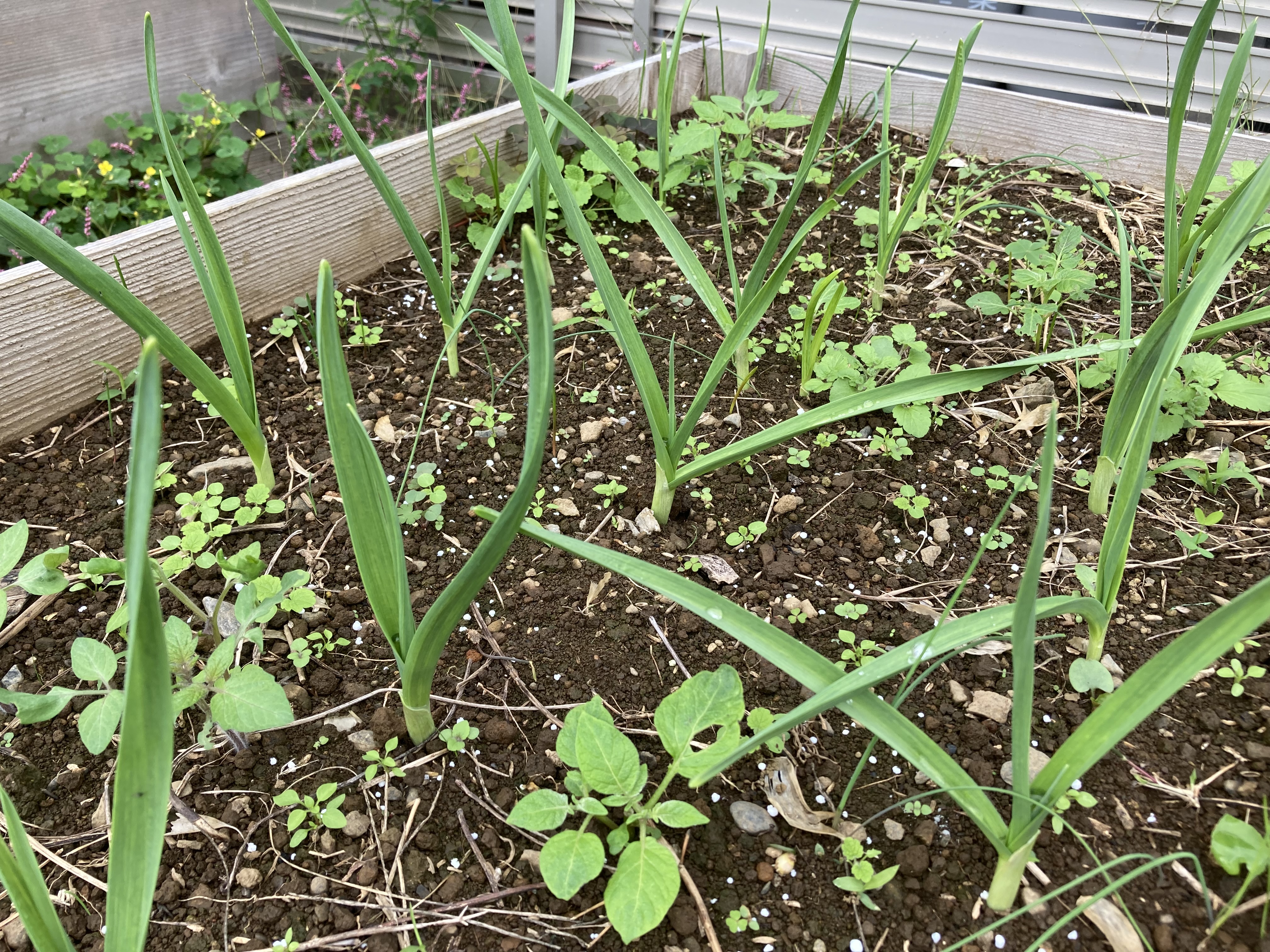 球根を植えたのが9月の27日、1週間後の10月4日に早くも芽を出し始め、今回植え付けから約3週間後の観察になります、ニンニクは冬には枯れて球根だけで越冬しますが、そこまでに葉を4枚以上出させる必要があります、現在平均で3枚は出ています。