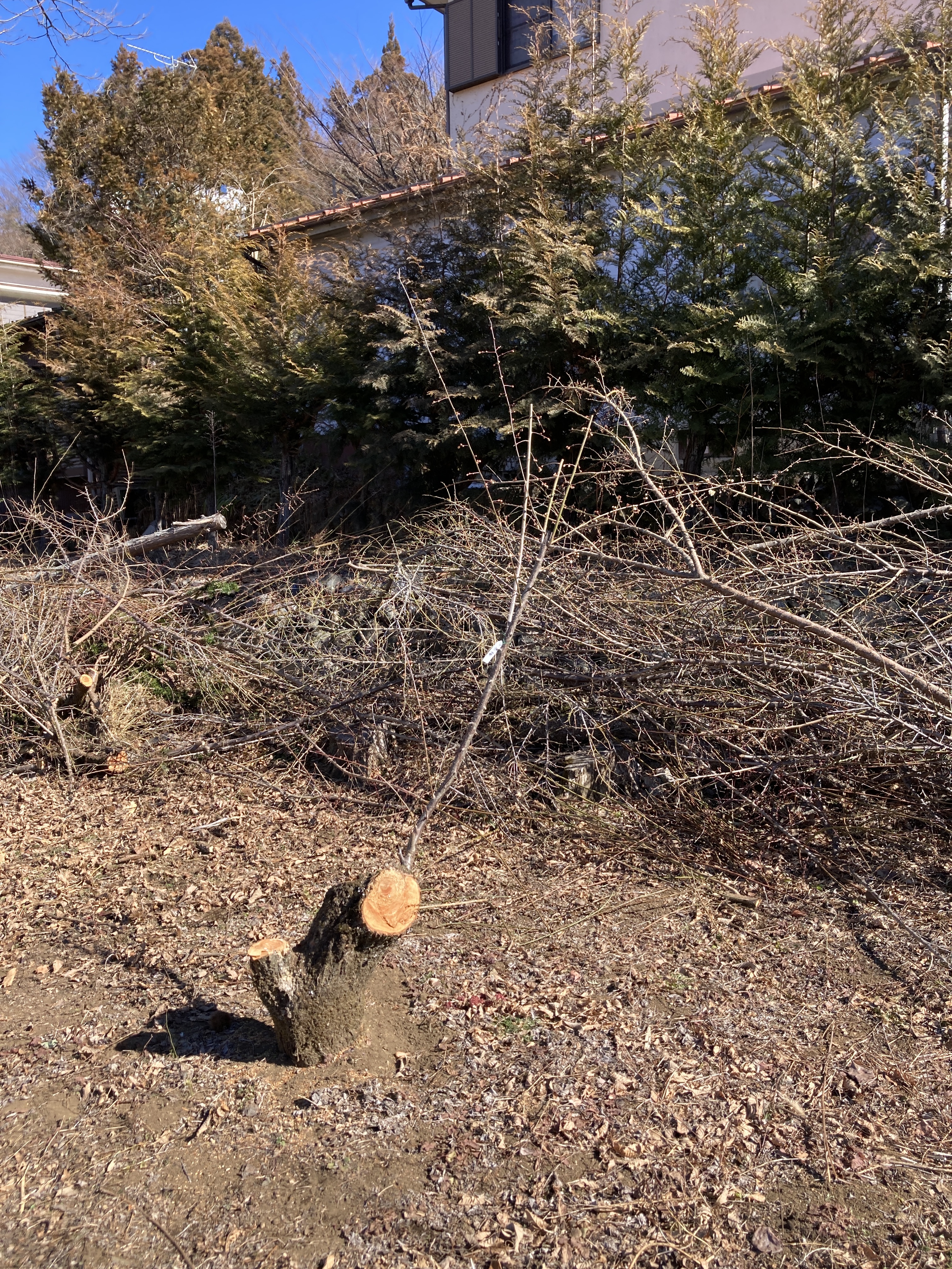 枯れかけていた木は4本ほどあり、こちらは大胆に枝を根元から全て切り落とし若い枝1本だけにするという更新剪定を実施しました、上手くいけば3年で枝が更新し蘇ってくれます、下手すれば全て枯れてしまいます、そこまで放置されていたのです。