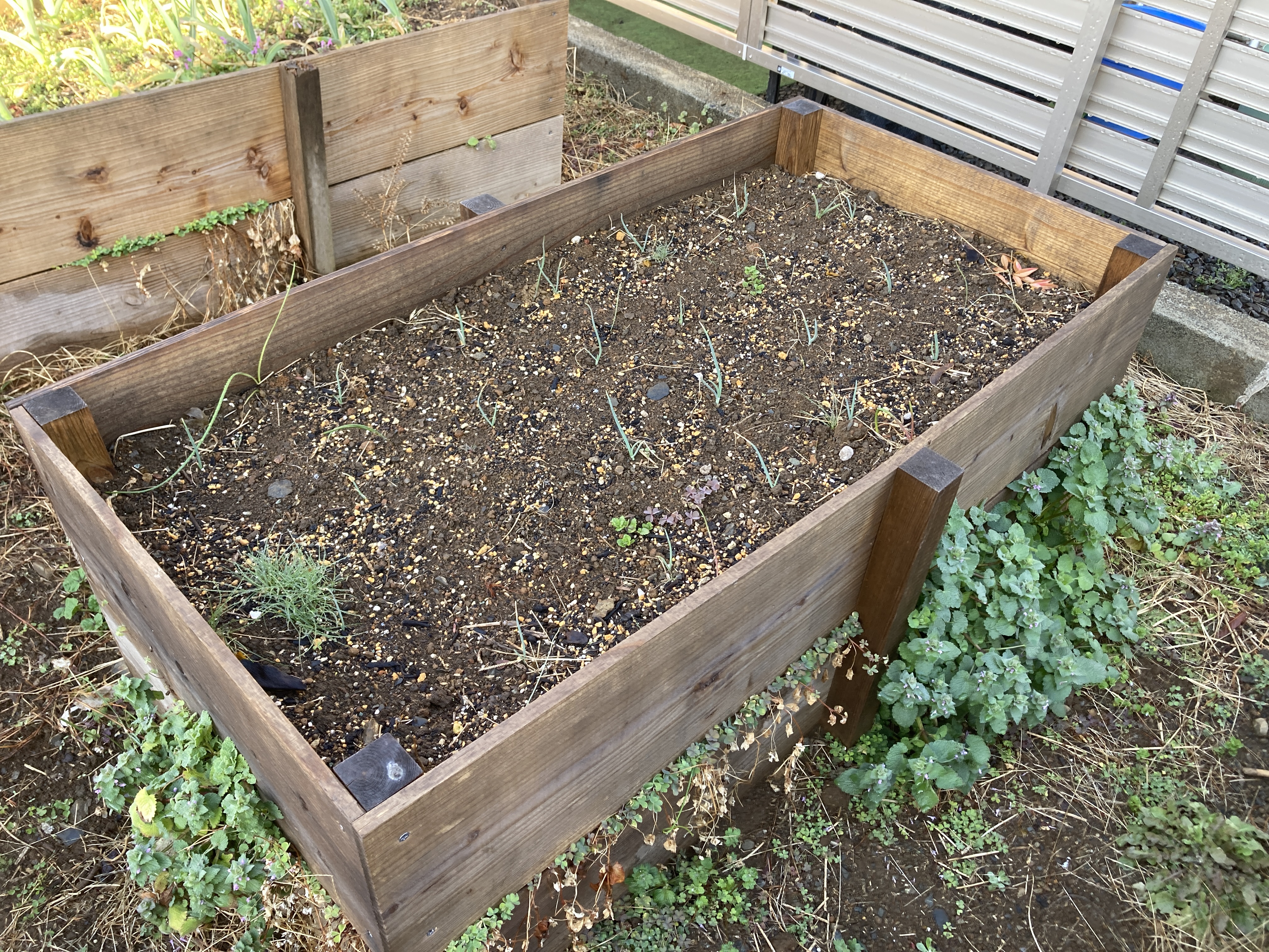 レイズドベッドを増設しましたので4つのレイズドベッドにタマネギの苗を昨年11月上旬に植えました、普通の白と赤タマネギを種から2ヶ月育てた苗を植えましたが種蒔きが遅かったのか苗がほとんど成長しておらず1か月後には枯れてしまったものもあります。