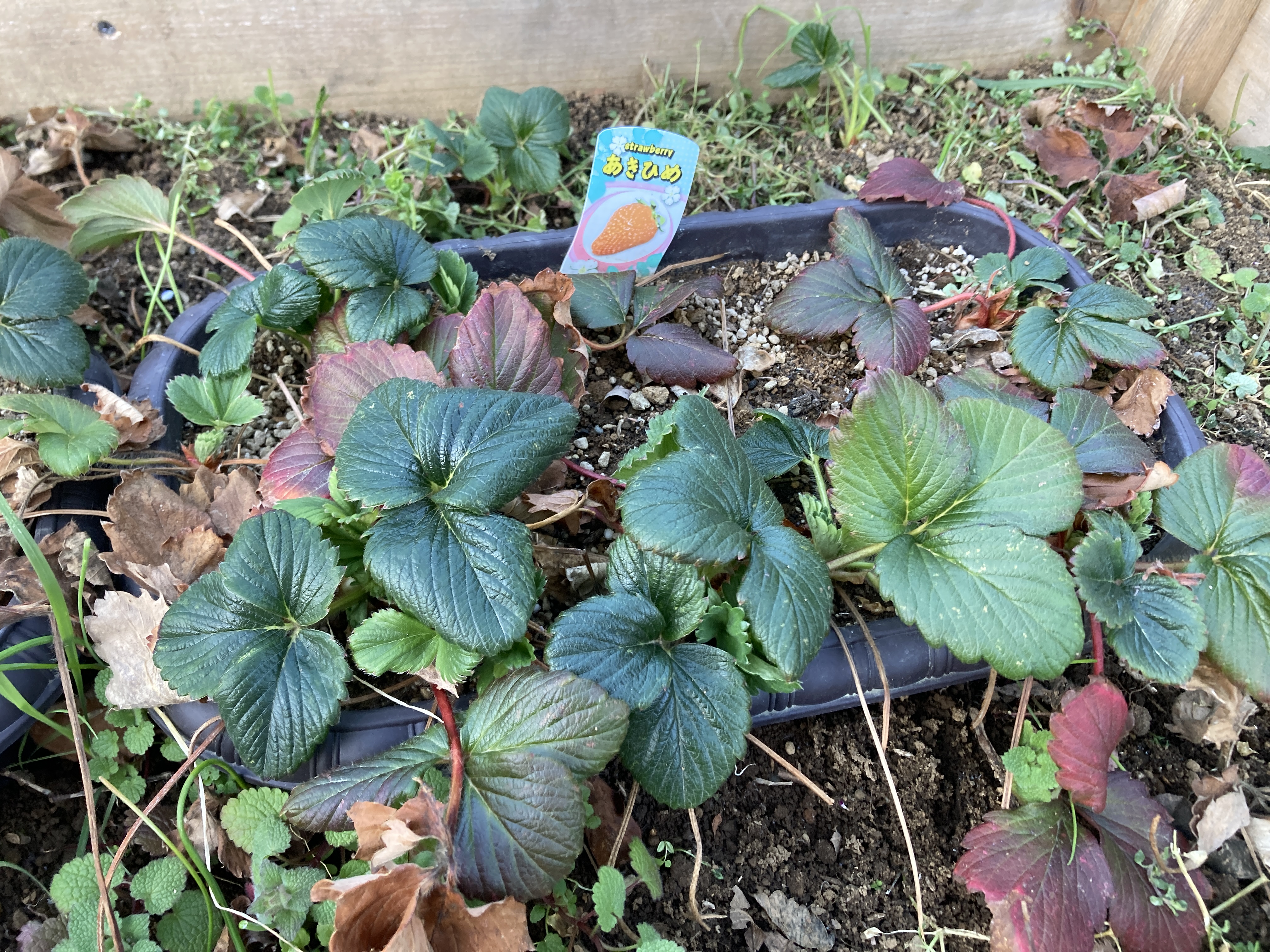10月初旬、東京ラボで半年間育てたイチゴの苗をレイズドベッド5号&6号に定植しました、種は章姫と紅ほっぺですが定植した際にごちゃまぜになってしまいました。