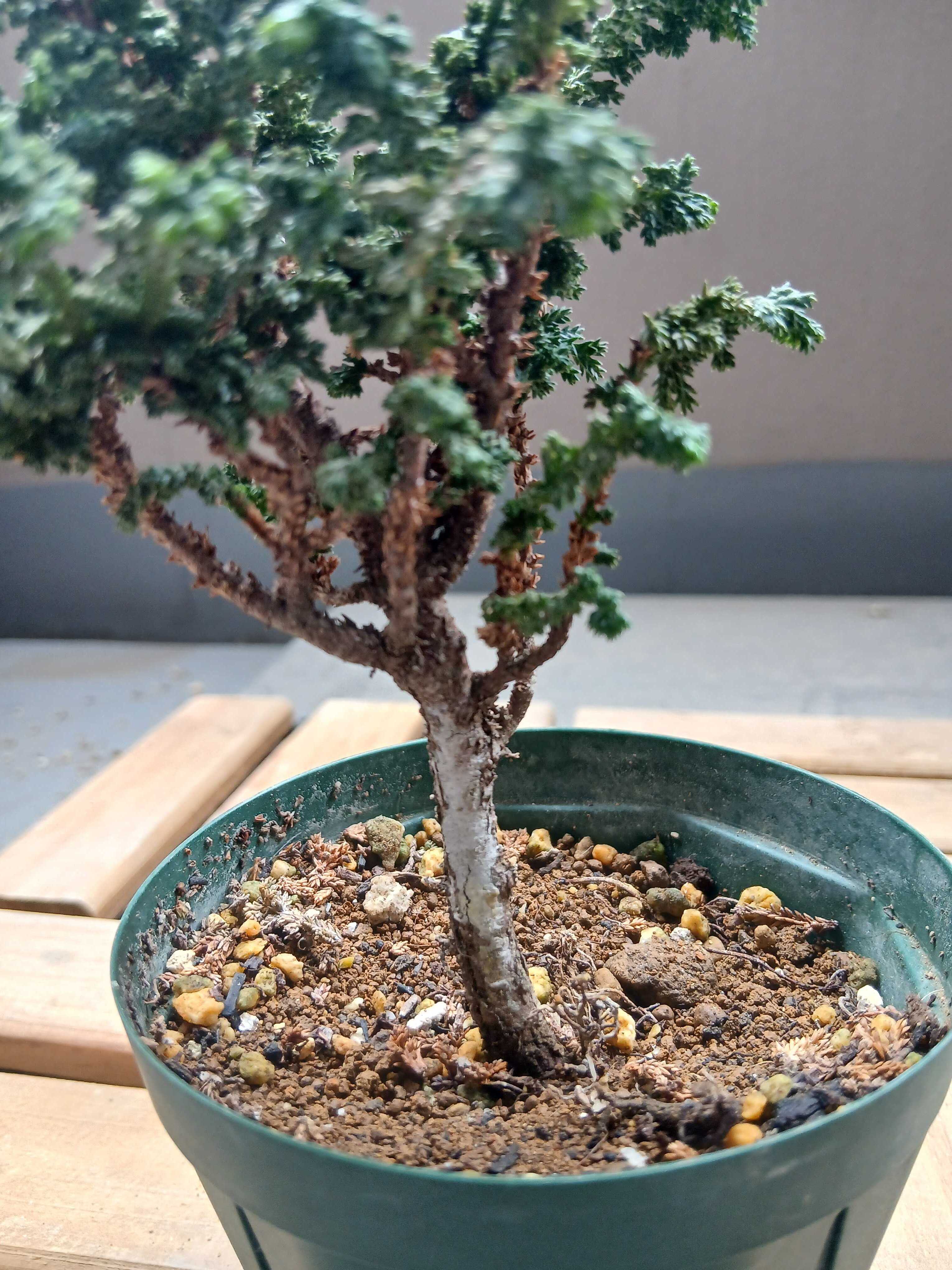 白くなった部分をピンセットでつついてみても、何かが付着しているわけではなく、幹の色が変わっている感じでした。水やりを鉢の上からセッカヒノキにかけるようにして挙げているので、その影響があるのかもしれません。いずれにせよ、少し様子見をします。