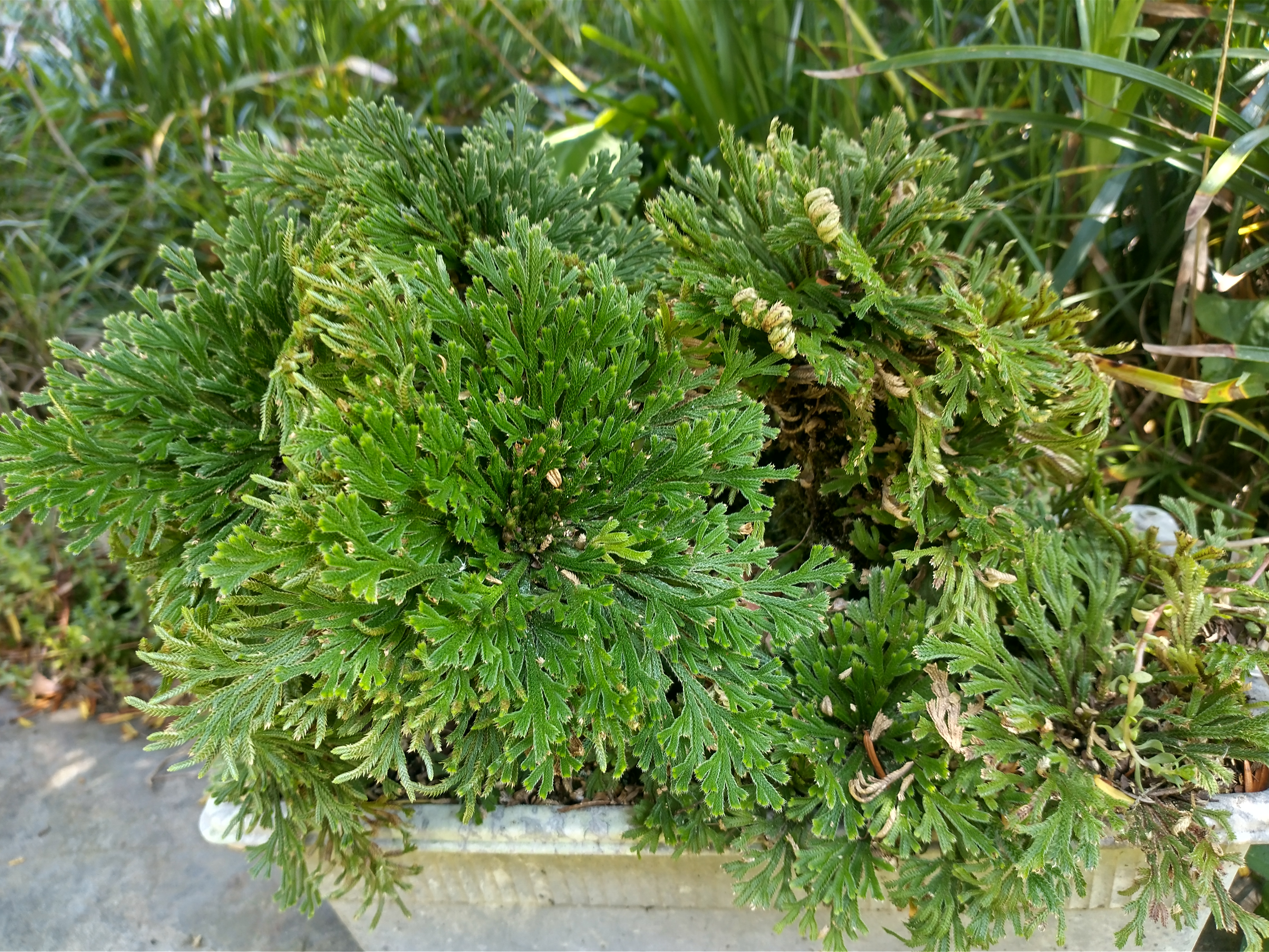 イワヒバの鉢に自然に生えてきたイワヒバ(右)との仲間のカタヒバ(左)
