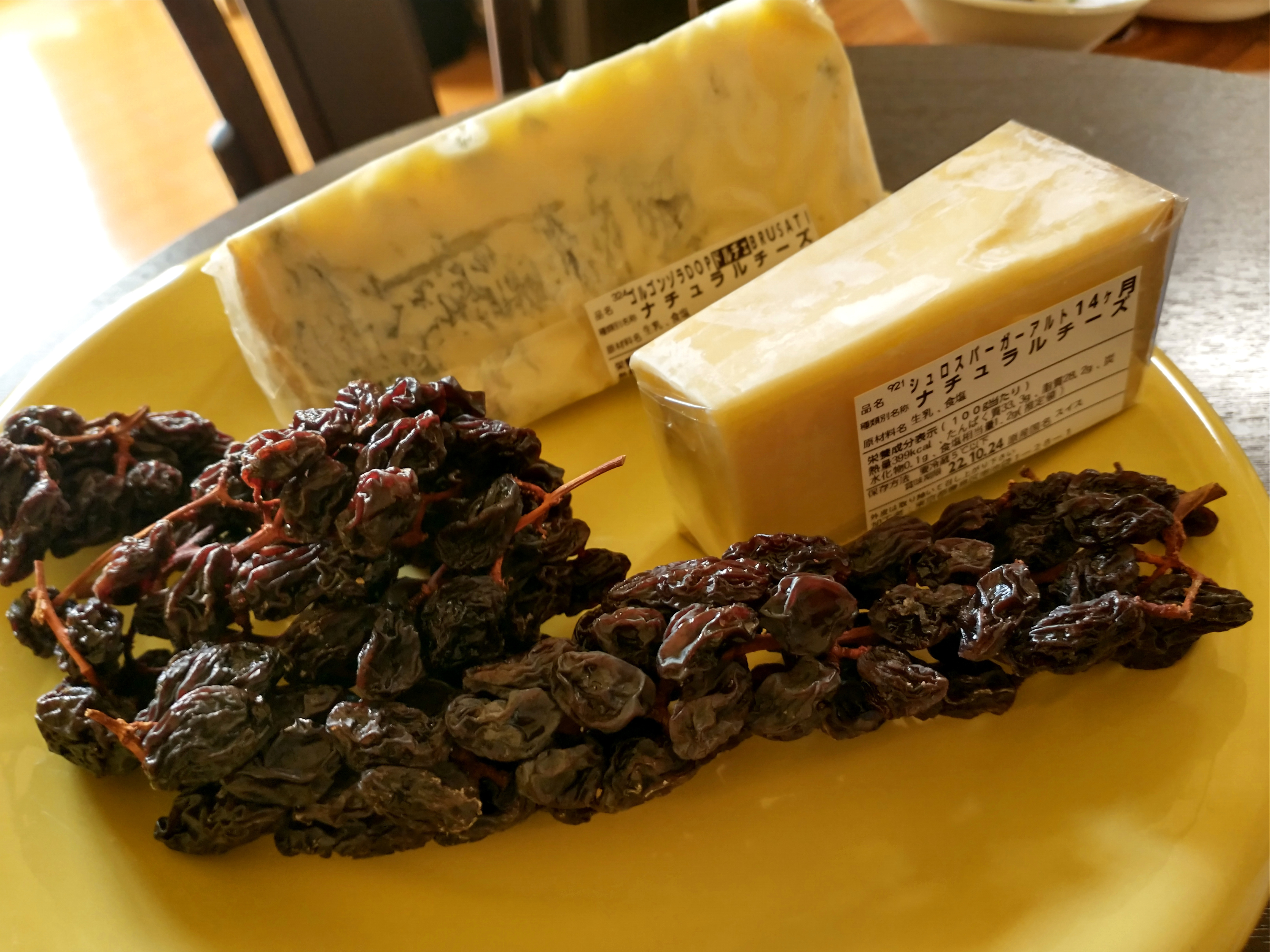 デパ地下のチーズ売り場には世界のドライフルーツも売っているのでチーズと共に買ってきます、枝付きは大粒のレーズンなので数粒を枝ごとカットしてチーズ盛りに添えると良いと思います。